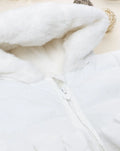 A cute girls' hooded down jacket. The piece is all-white with tone-on-tone bows on the front. It features a white fur insert. The front zip provides a comfortable, practical fit. Accessories are not for sale. The package contains the item of clothing only.