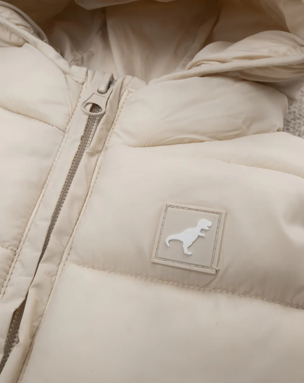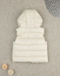 A cute hooded vest for boys in recycled nylon. The piece features a creamy white base with side pockets. The front zip closure provides a relaxed and practical fit. This vest is suitable for casual occasions. Accessories not for sale. The package contains the item of clothing only.