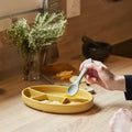All elements are made of high-quality silicone, a flexible, durable material that's perfectly suited to children. Silicone is naturally BPA-free, according to current regulations, ensuring safe meals. It's resistant to high temperatures, making it microwave and dishwasher safe for easy and hygienic cleaning. Plus, its non-slip, shatterproof texture makes it a durable and ideal option for helping your baby explore their first culinary adventures.